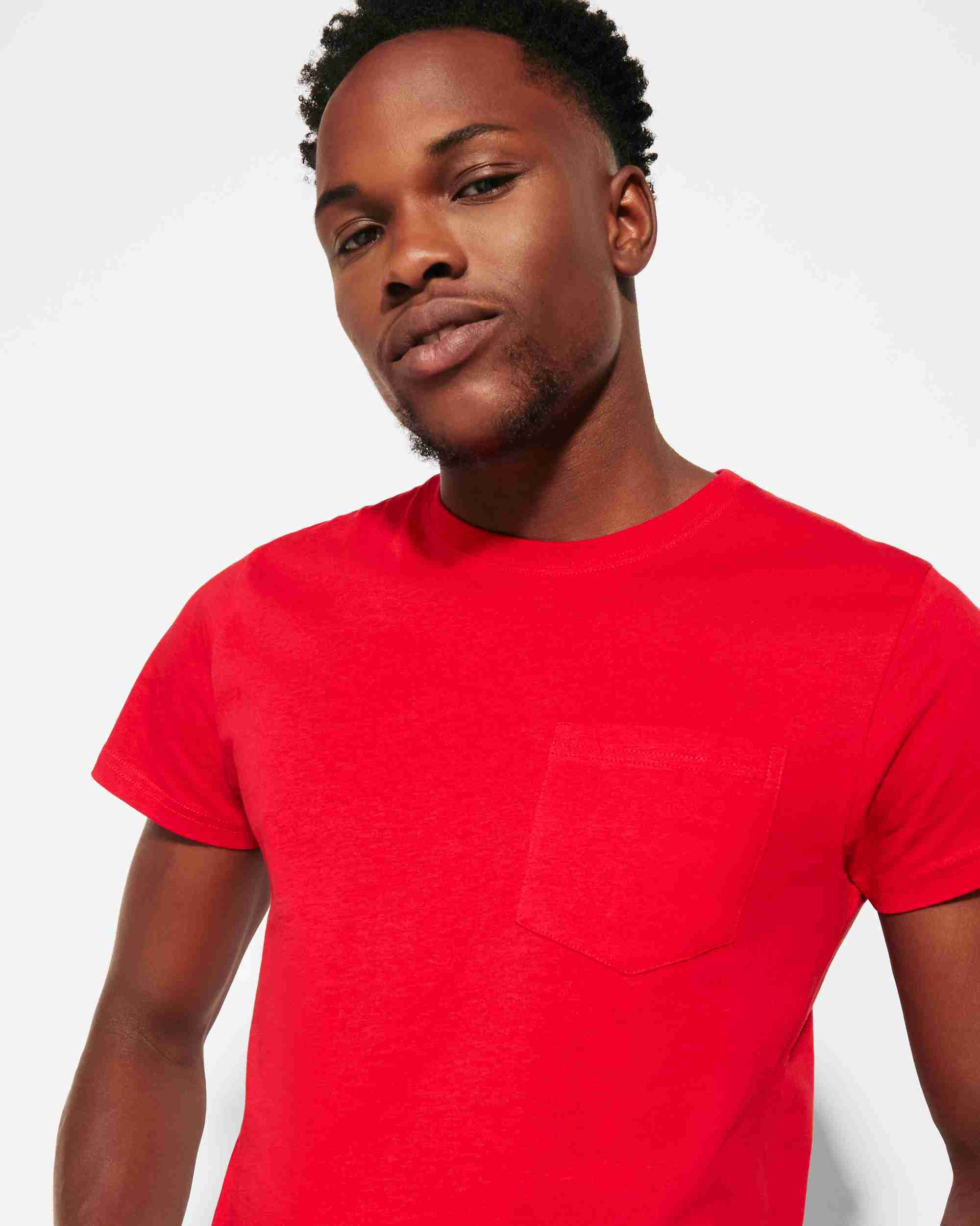 Camiseta de manga corta y cuello redondo de 4 capas. Cubrecosturas reforzado en cuello y hombros, costuras laterales y bolsillo frontal.