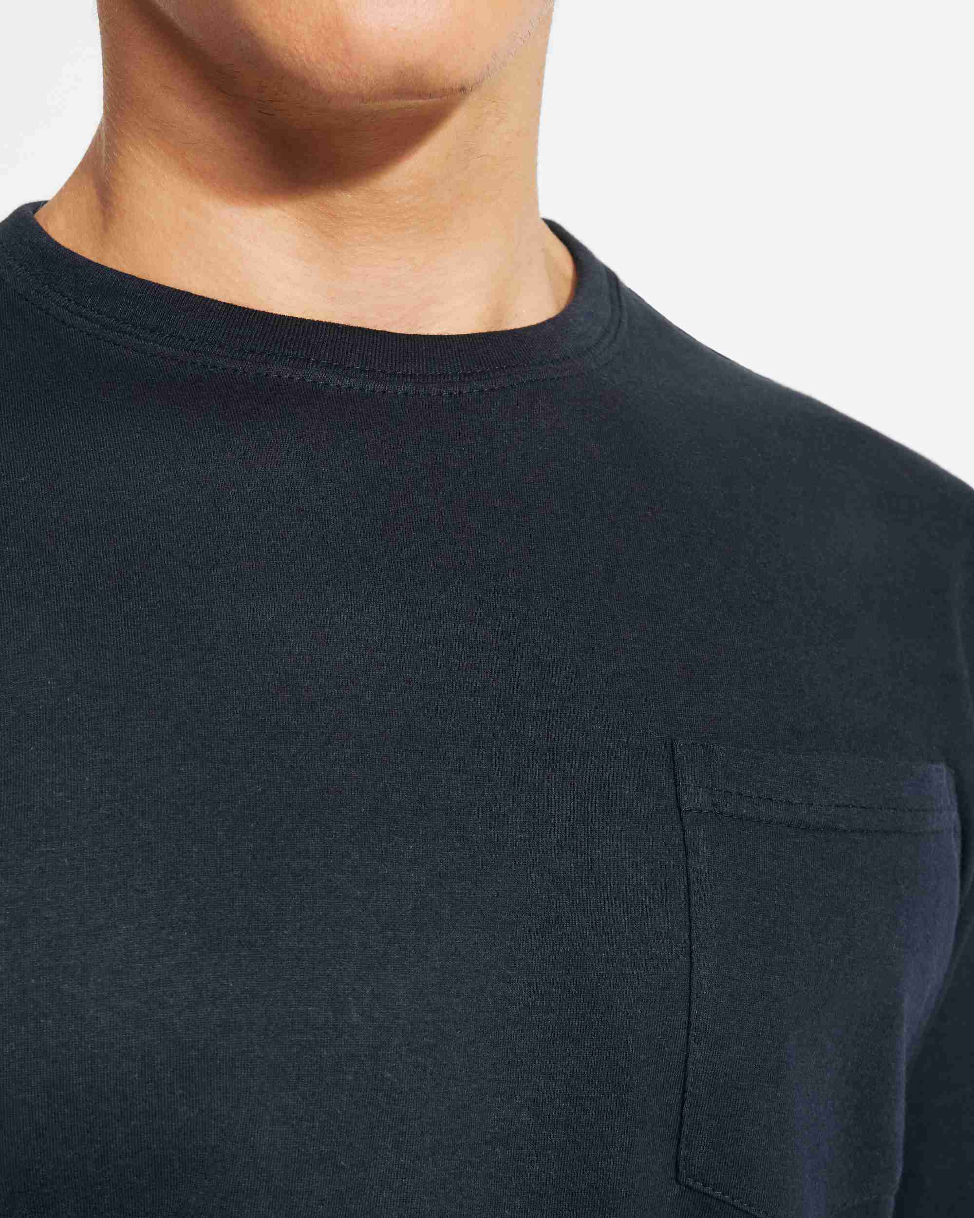 Camiseta de manga larga con cuello redondo y puños en canalé 1×1. Bolsillo en pecho izquierdo. Cubrecosturas reforzado en cuello y hombros.