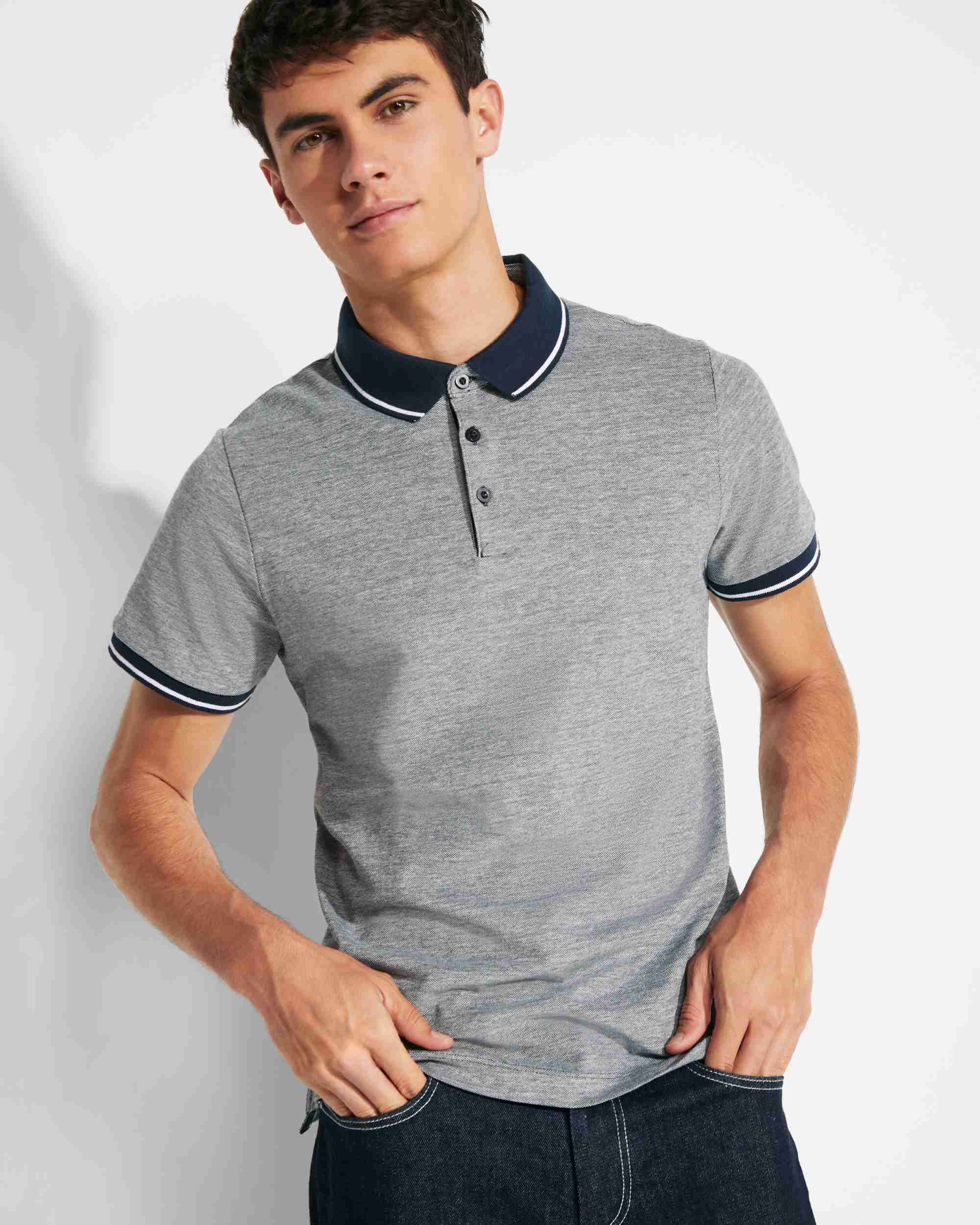 Polo Vigoré de manga corta. Cuello y bocamangas en color solido con canalé 1×1 y detalle decorativo a contraste. Tapeta interior con cinta decorativa a contraste y tres botones. Bajo con apertura lateral reforzada y cinta decorativa. Espalda ligeramente más larga que el delantero.