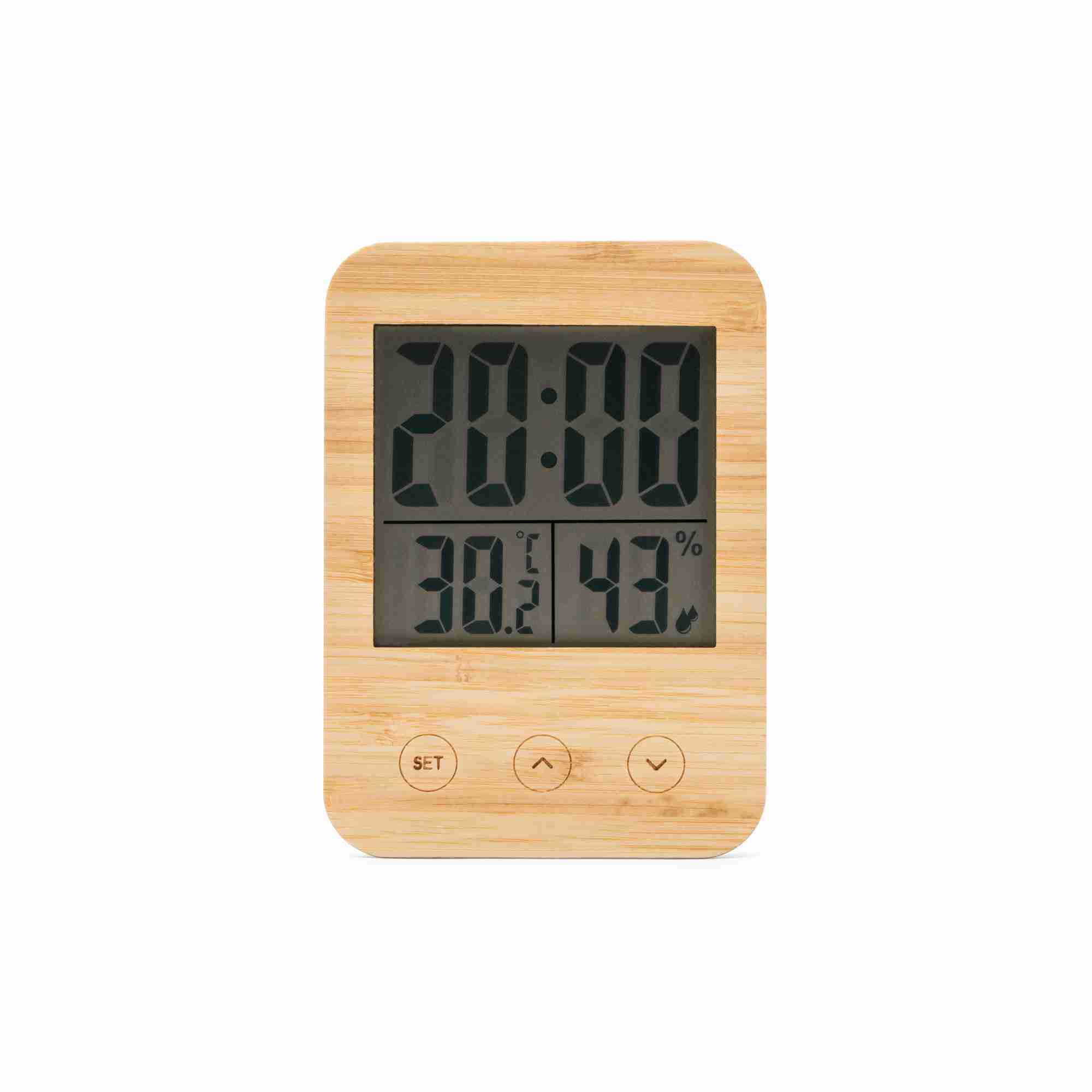 Estación meteorológica con carcasa frontal de bambú. Función reloj con sensores de temperatura y humedad. Panel de control táctil. Registro de temperatura y humedad máxima y mínima. Funciona con 2 pilas AAA no incluidas.