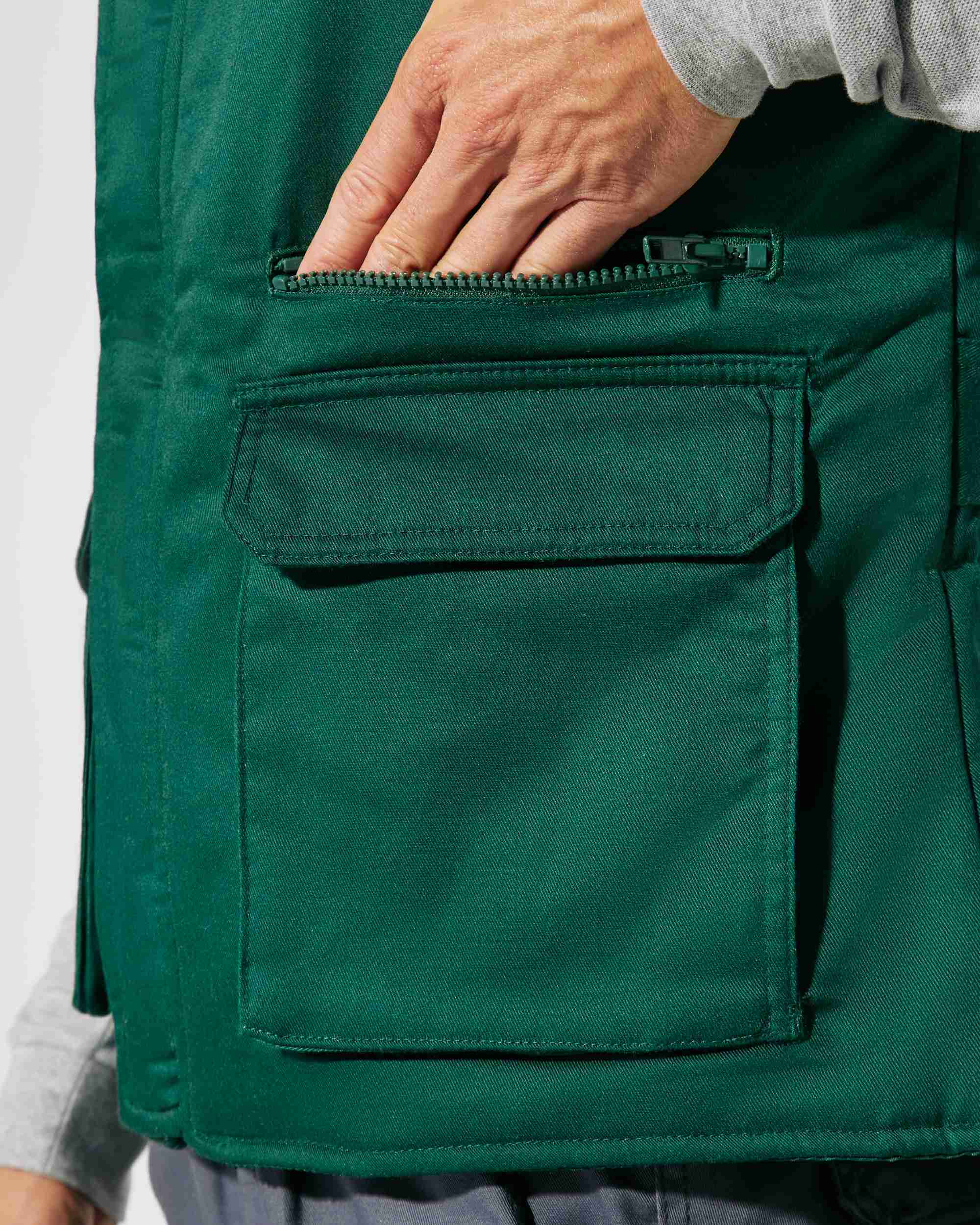 Chaleco laboral multibolsillos con cuello alto.